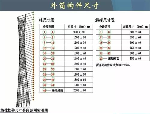 廣州塔的塔身由下而上富有大小變化。其中,底部橢圓直徑尺寸約為60米×80米,高寬比為7.5;中部最細處橢圓直徑約為30米,高寬比為7.3。上部橢圓直徑尺寸約為40.5米×54米。24根立柱的間隔距離相當,協(xié)調(diào)統(tǒng)一。