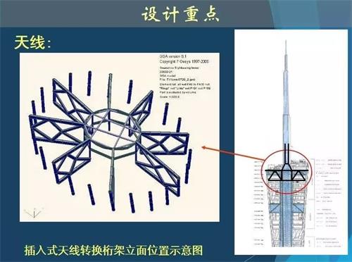 另外,由于廣州新電視塔處于飛機轉(zhuǎn)向區(qū),按照規(guī)定,該處飛機在航線所處位置周圍300米內(nèi)不能出現(xiàn)障礙物,新電視塔上方飛機飛行高度為海拔900米,因此,為確保飛機飛行安全,也對塔頂天線做了細部處理,現(xiàn)已從塔頂天線撤出10米,最終高度為600米。