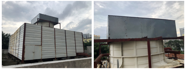 改造前為高轉(zhuǎn)速動(dòng)力系統(tǒng),噪音大 出風(fēng)口被擋住,散熱效率差 冷卻塔接水盤(pán)破裂
