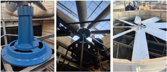 安裝新的冷卻塔超靜音風(fēng)機(jī),拆掉出風(fēng)口消聲器 更換新的冷卻塔不銹鋼接水盤(pán)