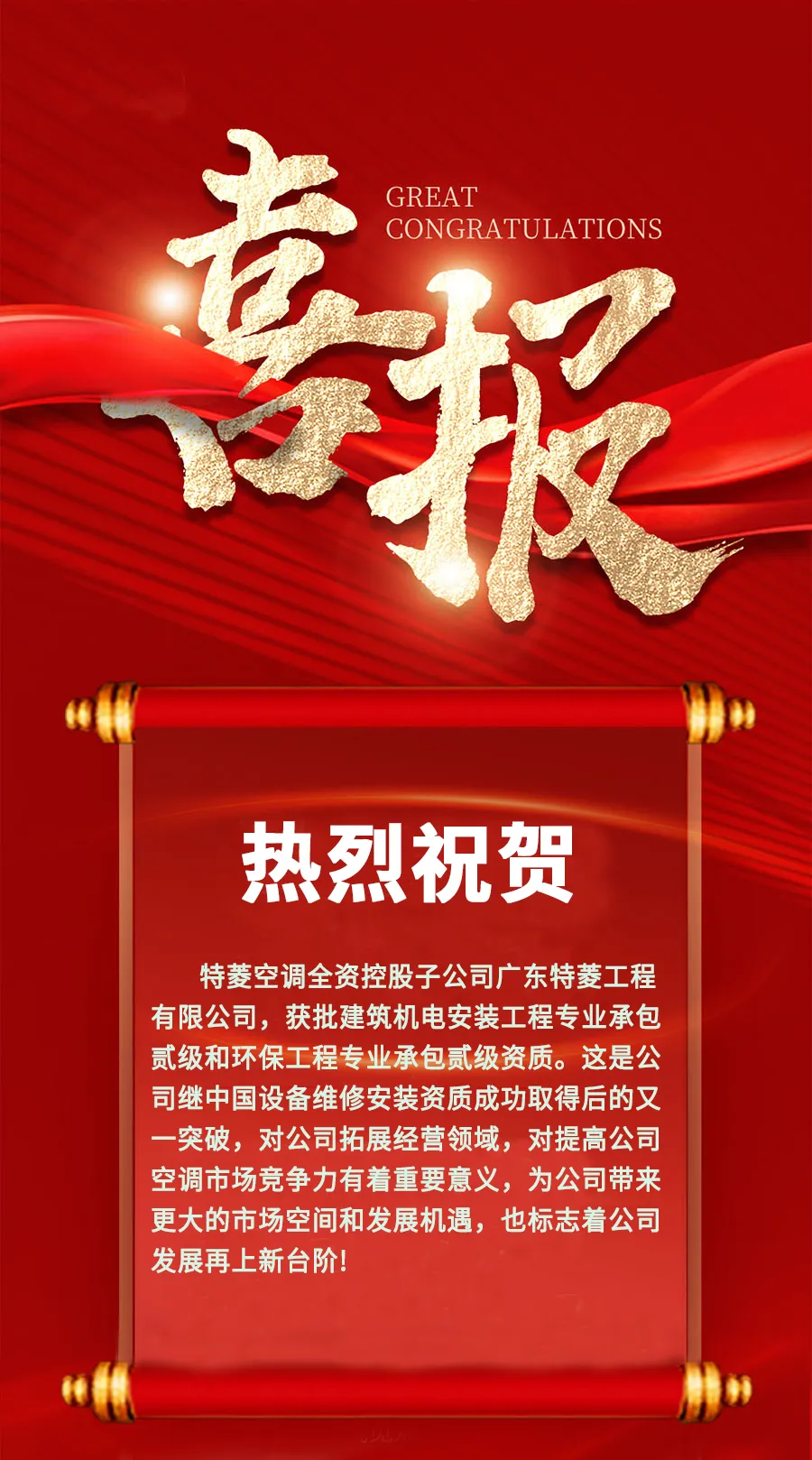 喜報(bào)!特菱空調(diào)全資控股子公司廣東特菱工程有限公司獲批