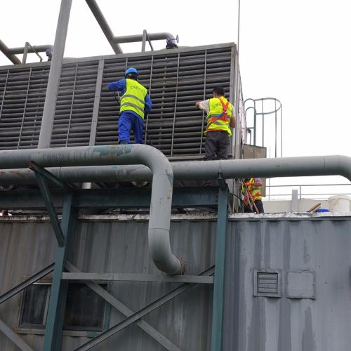 冷卻塔清理,由于冷卻塔暴露于大氣中,運(yùn)行過程中會(huì)有大量的泥沙、藻類等附著于冷卻塔填料表面,不清理干凈會(huì)在以后的運(yùn)行中將這些污垢沖洗到冷卻器內(nèi)造成冷卻器內(nèi)熱交換銅管的堵塞,影響熱交換效果,所以必須對(duì)冷卻塔進(jìn)行徹底清理。