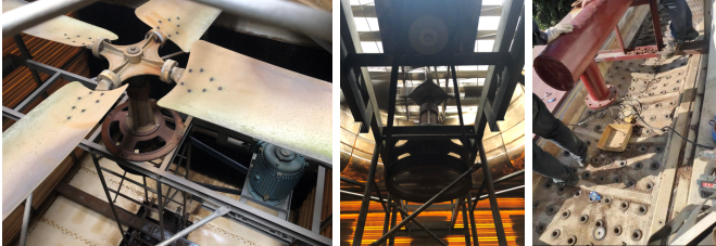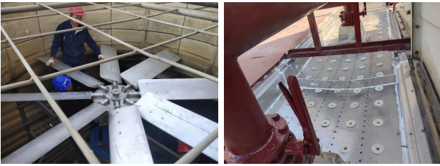 安裝新的冷卻塔超靜音風(fēng)機(jī),拆掉出風(fēng)口消聲器 更換新的冷卻塔不銹鋼接水盤(pán)